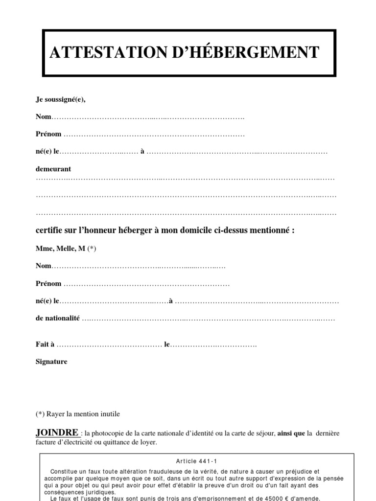 Vous serez alerté(e) par courriel. Disponibles en format pdf ou word, il s'agit de modèles d'attestation d'hébergement à imprimer et à compléter. Bien souvent, un modèle type de lettre est utilisé pour créer une attestation d'hébergement par exemple. Nous vous proposons sur notre. L'attestation d'hébergement ne répond à aucun formalisme particulier : Jun 27, 2021 · l'attestation d'hébergement, autrement appelée déclaration ou certificat d'hébergement, est un document justificatif qui peut être demandé à un particulier lors de diverses démarches administratives et commerciales (ouverture d'un compte bancaire, souscription d'un prêt, renouvellement de papiers d'identité auprès de la préfecture ou de la mairie, enregistrement d'un. An attestation d'hébergement is a certificate to prove that you are living permanently at an address in france. Attestation d'hebergement (à remplir très lisiblement) attention : Attestation d'hébergement je soussigné( e) : Au cas où vous devez produire une attestation d'hébergement pour accomplir une démarche administrative, mais que vous ne disposez pas d'adresse à votre nom, vous pouvez toujours solliciter la personne qui vous reçoit gratuitement de rédiger pour vous une attestation d'hébergement. Sep 29, 2020 · attestation d'hébergement à remplir. Il s'agit d'un simple document établi sur papier libre, dans lequel l'hébergeant déclare héberger l'héberger. Sep 29, 2019 · attestation d'hébergement :